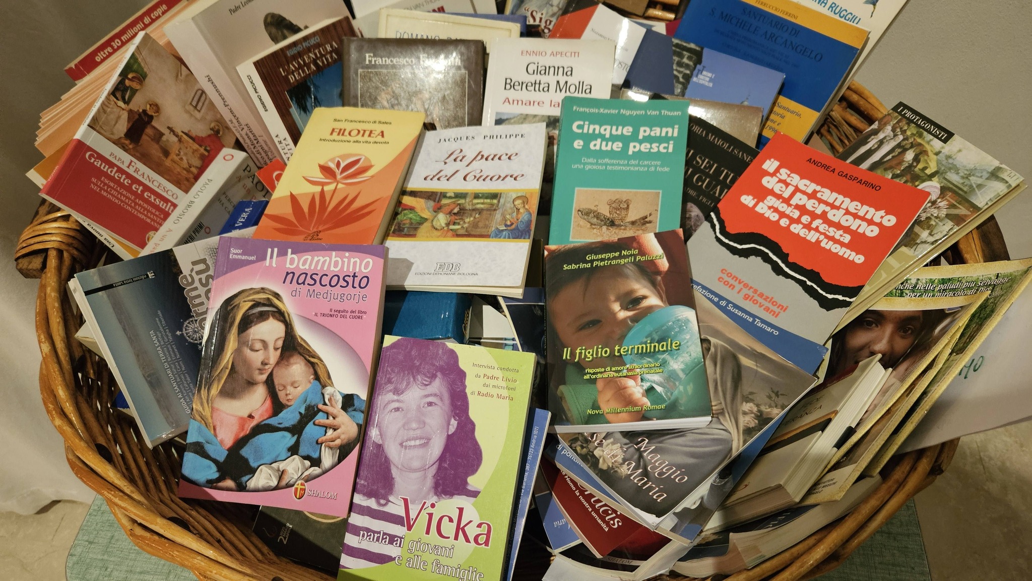 della chiesa trovate un cesto con tanti libri. Vengono venduti a 1/4 del loro