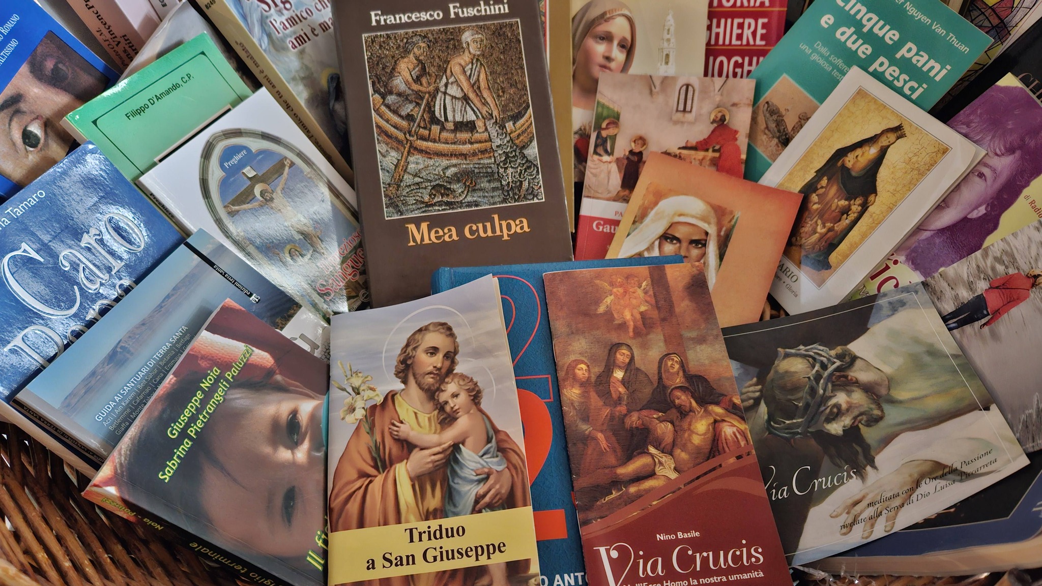 della chiesa trovate un cesto con tanti libri. Vengono venduti a 1/4 del loro